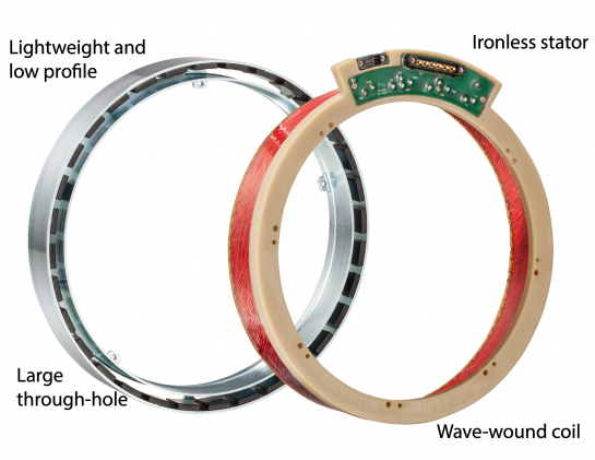 Durch die Außenläufer-Bauweise (Rotor befindet sich auf der Außenseite des Stators), bieten die neuen Bausätze ein mechanisches Merkmal, für Anwendungen, die eine Außenrotation um ein stationäres Zentrum benötigen.